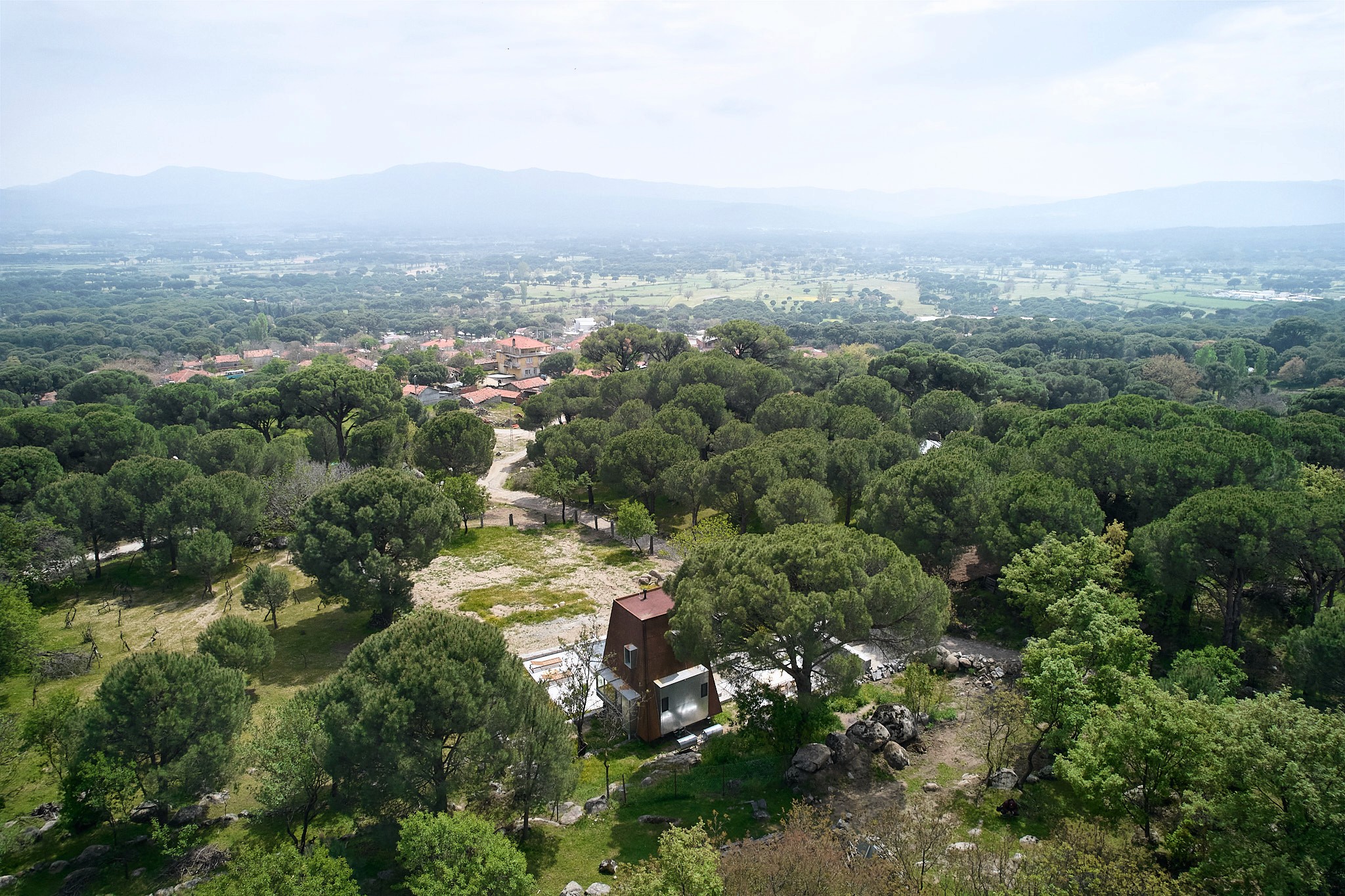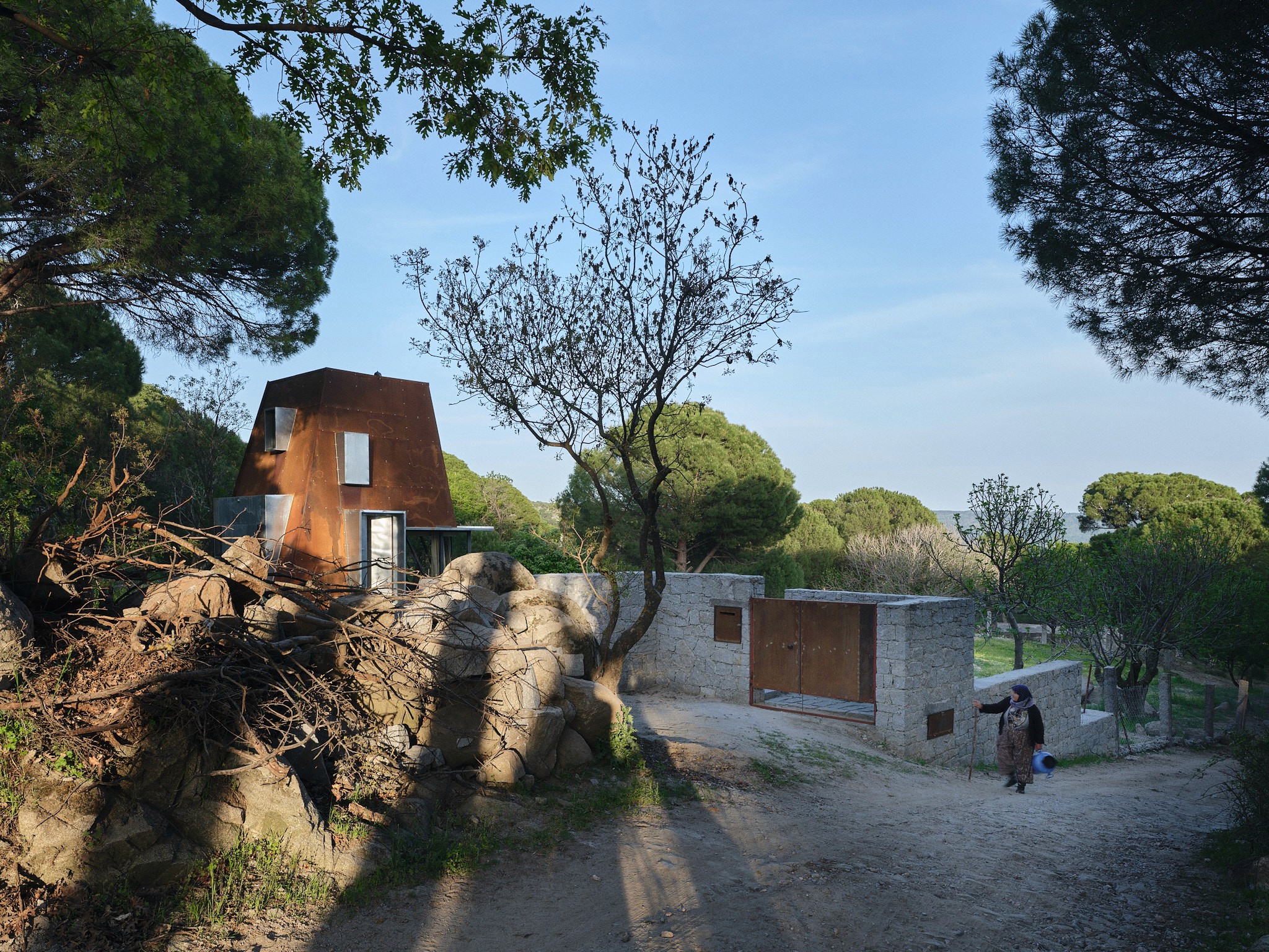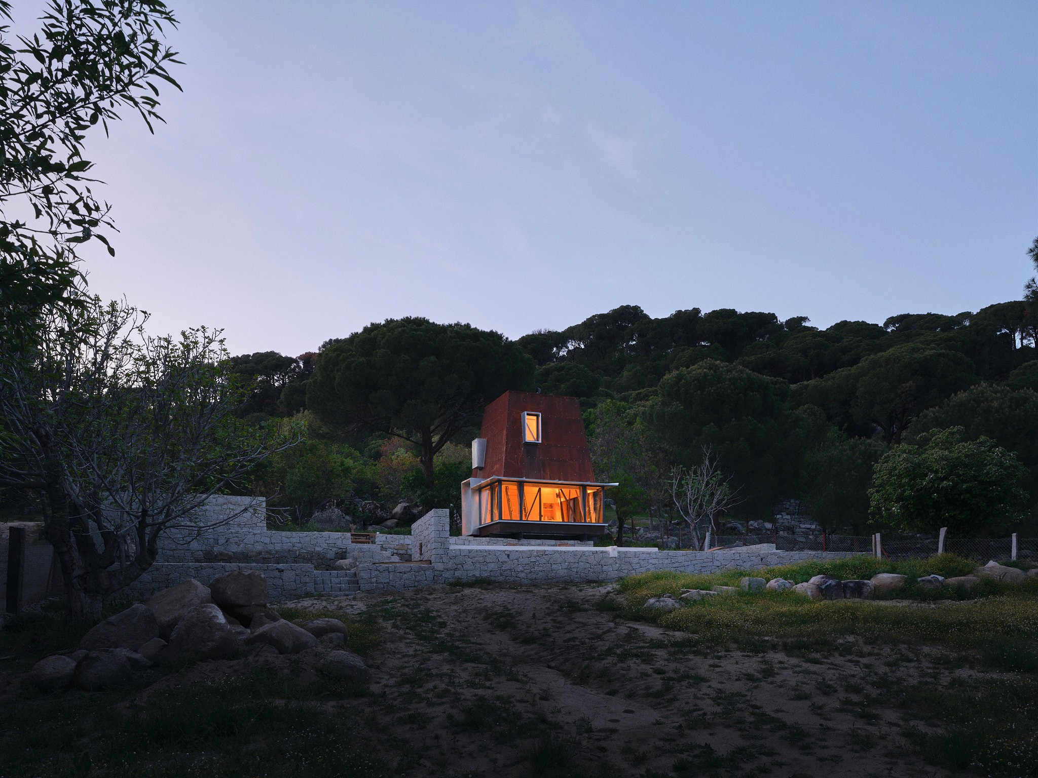 The reinforced dry stone wall that serves as the foundation is intentionally complemented with the existing, irregular arrangement of stones in the terrain. The in-situ reinforced concrete foundation is poured into it. The structural steel system, detached from the topography, and the corten steel façade panels are prefabricated in the workshop, with only their assembly carried out on-site.